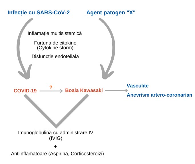 O formă severă de complicații este dată de anevrismele coronariene, a căror ruptură duce la apariția trombozelor și chiar la infarct miocardic. Răspunsul inflamator sistemic (față de pneumonie) poate potența un proces inflamator existent la nivel coronarian, producând disfuncția endotelială și accelerând astfel dezvoltarea KD. Prin urmare, infecția cu SARS-CoV-2 și hiperinflamația din boala COVID-19 ar putea acționa ca un „declanșator al amorsării” KD (Fig. 1).