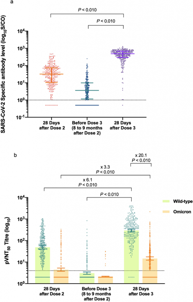 De remarcat faptul că în ziua 28 post doză de rapel, un număr de 228 (78,08%) participanți au demonstrat o activitate de neutralizare împotriva variantei Omicron, iar doza de rapel a dus la o creștere de ~3,3 ori a activității de neutralizare față de varianta Omicron, în comparație cu cea de-a doua vaccinare, deși GMT a arătat o reducere de la 20,1 ori la 14,66 (12,30–17,48) comparativ cu tulpina WT (Fig. 1b), demonstrând abilitatea variantei Omicron de a șunta protecția indusă de doza de rapel. În plus, sexul și vârsta nu au fost factori care s-au corelat cu titrurile de anticorpi neutralizanți împotriva SARS-CoV-2 și a variantei Omicron induși de doza de rapel.