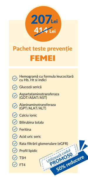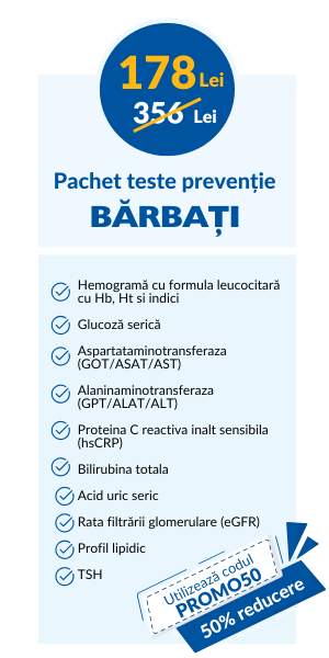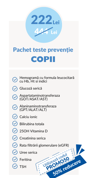 Astfel, în perioada 24 - 30 noiembrie 2025, cumpără online pachetul de analize potrivit, aplică codul PROMO50 în pagina de finalizare a comenzii și bucură-te de reducerea de 50%.