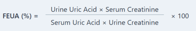 În acest context, excreția fracționată a acidului uric (FEUA) are un rol esențial, întrucât reflectă capacitatea rinichiului de a elimina acidul uric, exprimând proporția din încărcătura filtrată glomerular care este efectiv excretată urinar.